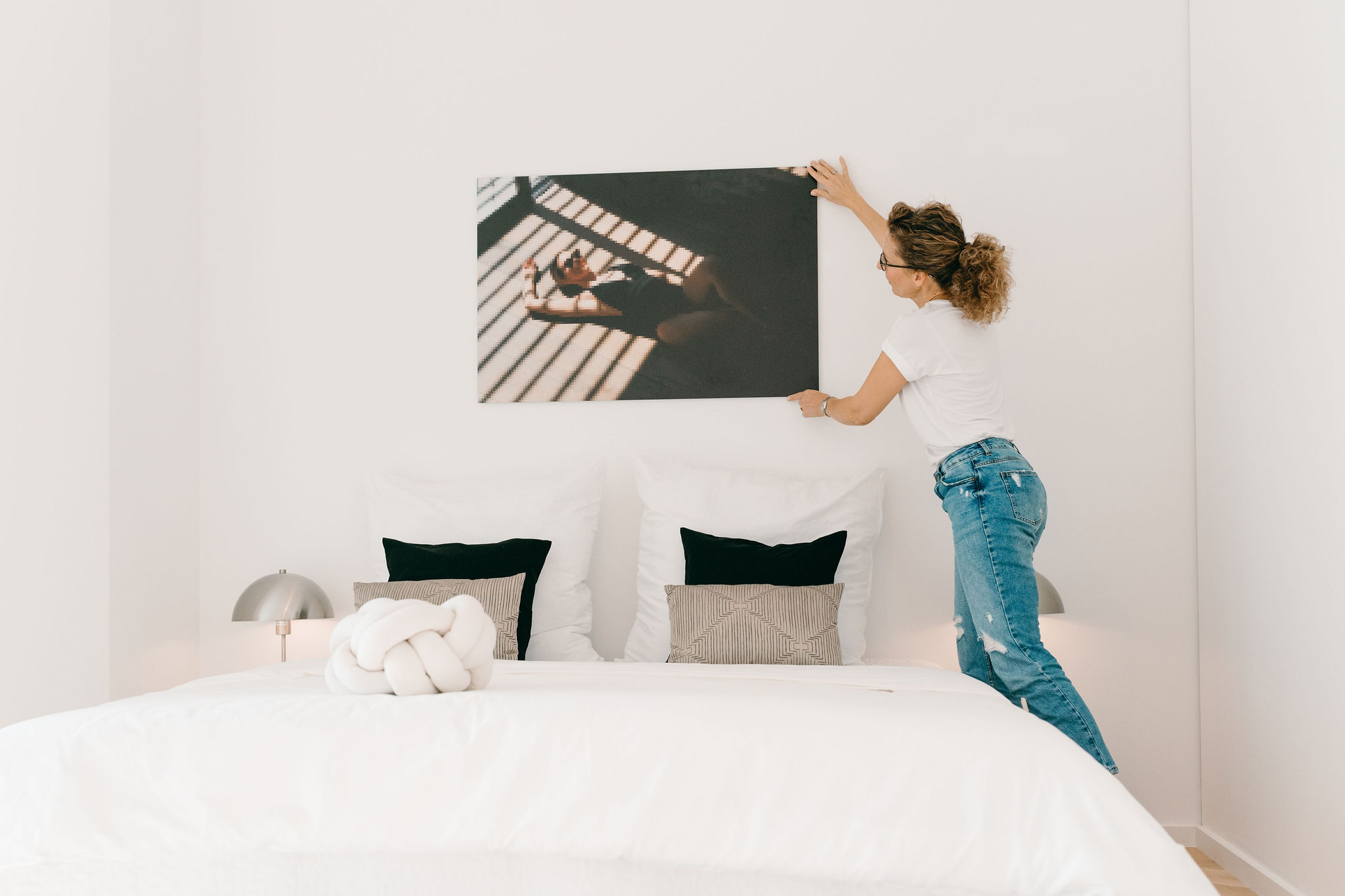 Bei der Immobilie angekommen, platziert und montiert das Umzugsteam entsprechend unseren Anweisungen die Möbel, während der Elektriker die Leuchten anbringt und wir die Accessoires auspacken und beginnen zu dekorieren. Bis zu sieben Personen arbeiten nun gleichzeitig in Ihren Räumen. Gardinen werden aufgehängt, Teppiche ausgelegt, Bilder angebracht. Wir rücken, probieren aus, dekorieren und kontrollieren solange bis wir zufrieden sind. Zum Schluss wird Überflüssiges wieder eingepackt und noch einmal durchgesaugt.